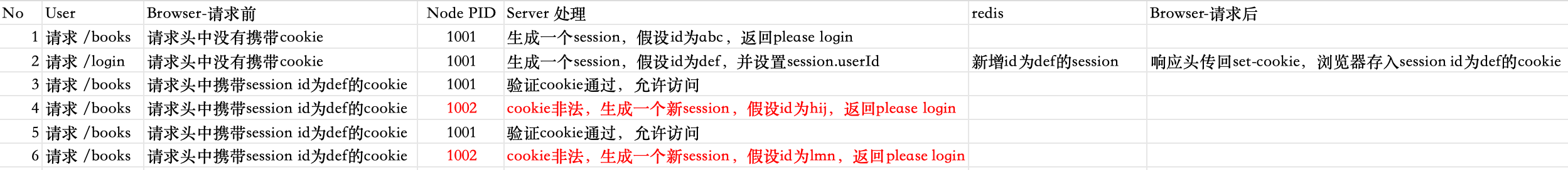 createHmac()生成新签名。将新签名和请求头中cookie签名部分进行比对,发现不一致,认为这个cookie非法,将重新生成session(假设id为hij)。这个新session没有初始化,不会存入redis。响应头也不会设置set-cookie。由于新session没有userId,会被系统认为未登录,服务器返回please login。 - 第五次请求:用户请求/books,假设这次请求又由pid为1001的进程处理。请求头中会携带session id为def的cookie,session中间件拿到这个session id,结合值为'0.33428147393240304'的secret,使用